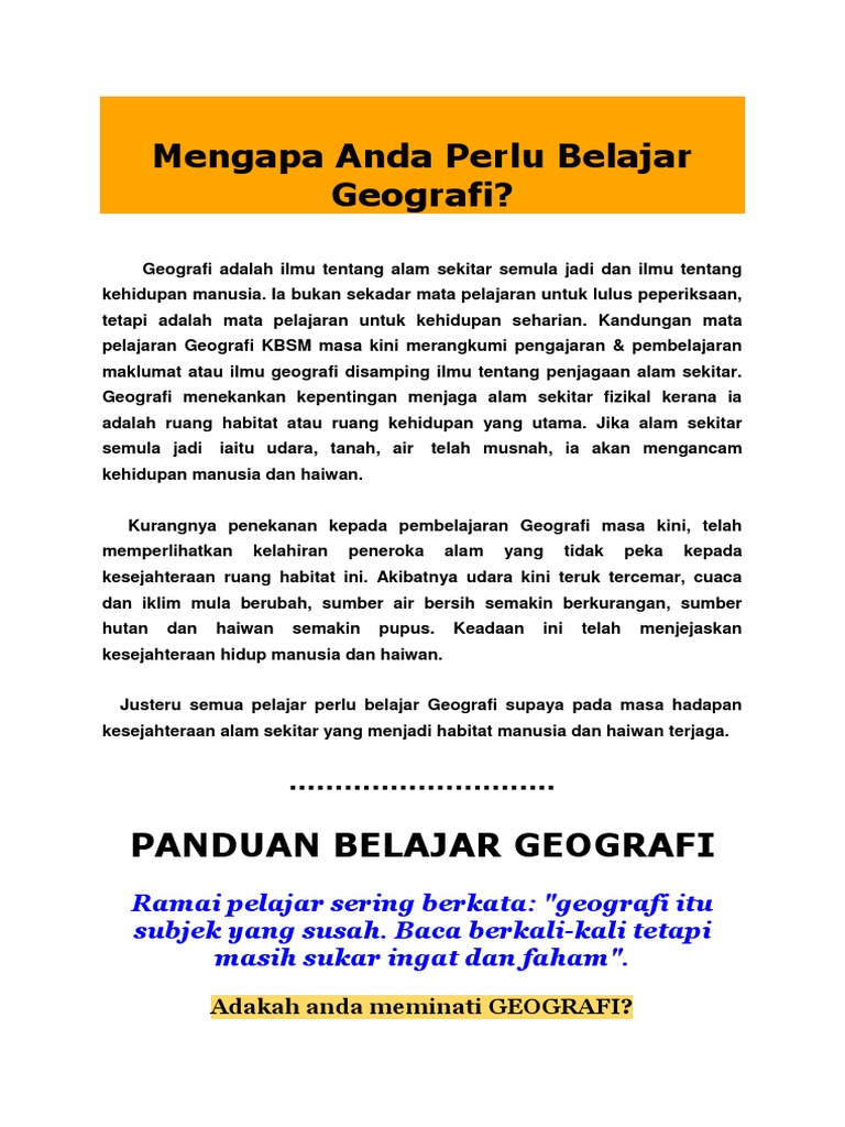 Dengan mengombinasikan prinsip-prinsip umum cara belajar yang baik ditambah langkah-langkah spesifik meningkatkan pengetahuan geografi serta membantu mengingat istilah dan informasi Anda bisa memiliki peluang terbaik mendapatkan nilai bagus saat ujian. Guru menunjukkan sekeping foto sebatang sungai yang tercemar dengan sampah sarap. Cara Nak Mengajar Geografi Yang Menarik.